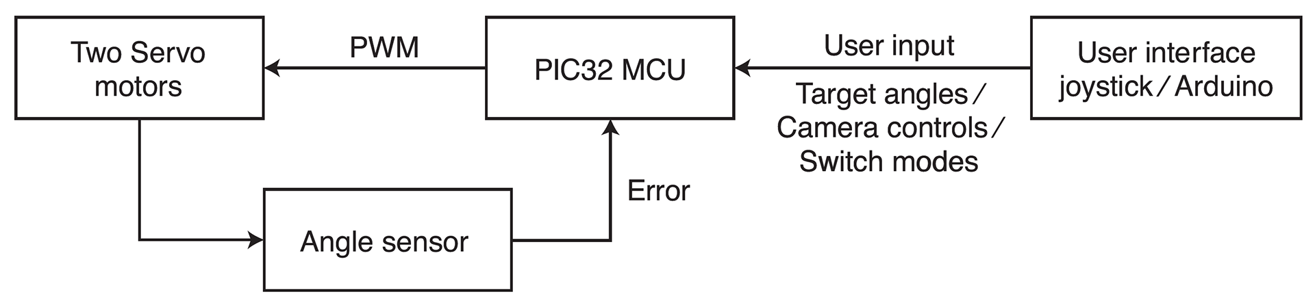 The figure on the left shows the overall logical structure of our design. Two servo motors actuate the camera and a Hall effect sensor measures its horizontal angle. The MCU takes inputs from the user to determine the target orientation of the camera, possibly with commands to switch control modes. Then, based on the error between the target position and current position given by the angle sensor, the MCU sends PWM signals to the servo motors, with the goal of reducing the error.